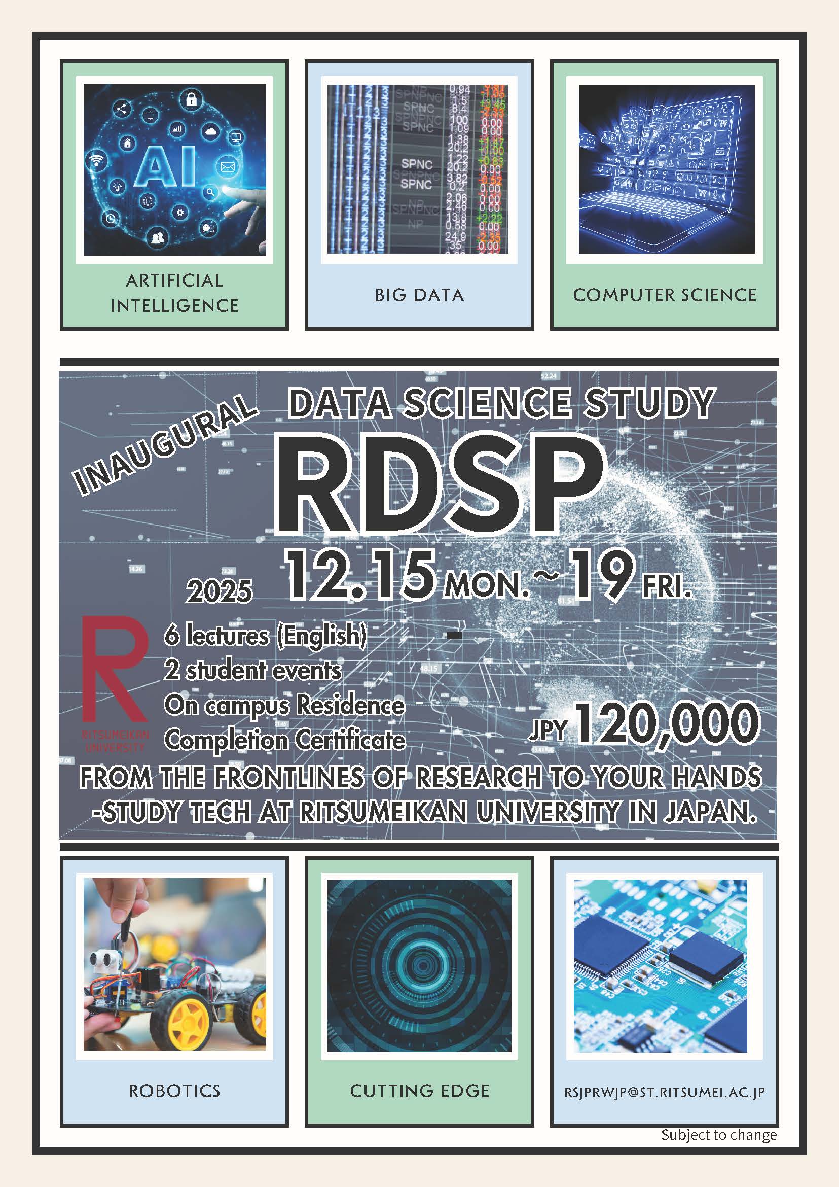 We are pleased to offer a new Data Science Program at Ritsumeikan University. This will be the first year of the program, and all classes will take place at our Osaka Ibaraki Campus (OIC) and Biwako Kusatsu Campus(BKC). Students will be taught in English.